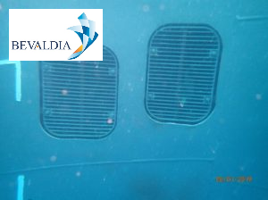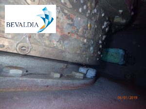 Bulbous Bow: Except from scratches caused by the anchor chain no other abnormalities of any nature were observed. Flat bottom, vertical sides and curves were found in good condition: shell plating, welded seams and butts without deformations or signs of pitting were observed. No blistering, scratches or bubbles were observed on the hull paint coating. Sea chests gratings were found in good condition: all grids were in position including bolts and nuts with securing arrangement. Bilge keels Found in good condition. No abnormalities were observed on the weld joints. Four bladed fixed propeller was found in good condition. No abnormalities, missing pieces, deformations, cracks, or chipping were observed. No entanglements or leakage of oil was observed on the tail-shaft. Rope-guard was found in position. Rudder was found in good condition and with rudder plug in position. No abnormalities of any nature were observed.
