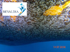 Underwater hull cleaning of vertical sides and curves which were found fouled locally with barnacles and marine growth and were cleaned. Flat bottom was found fouled with barnacles and marine growth and was cleaned by using hydraulic brush kart system. Propeller was found 100% fouled with salt and slightly fouled with thin barnacles which was cleaned and polished by using 3M diamond disc pads. EFP gratings were found 70% fouled with barnacles and were cleaned. ER gratings were found slightly fouled with 10% barnacles and were cleaned.