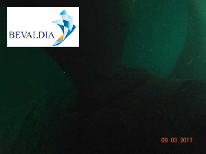 Flat bottom found fouled with barnacles and sea growth from 1cm up to 3cm thick. No abnormalities of any nature were observed. Vertical sides found 30% fouled with sea grass from 1cm up to 10cm and barnacles from 1cm up to 3cm thick. No abnormalities of any nature were observed. Curves were found 70% fouled with marine growth from 2cm up to 3cm thick. No abnormalities of any nature were observed. Four bladed pitch propeller was found 20% fouled with barnacles up to 1cm thick. No damages observed. Rudder found 70% fouled with marine growth up to 1cm and 30% with barnacles from 1cm up to 2cm thick. No abnormalities were observed. Sea chest gratings found 60% fouled with barnacles. All grids found in position with securing arrangement. Bow thruster blades 40% fouled with barnacles and bow thrust tunnel 70% fouled with barnacles from 1cm up to 3cm thick. Bilge keels found 80% fouled with barnacles up to 3cm thick. No abnormalities were observed. Anodes found 40% depleted. Tail-shaft found entangled with a great mass of fishnets which were dismounted and removed.